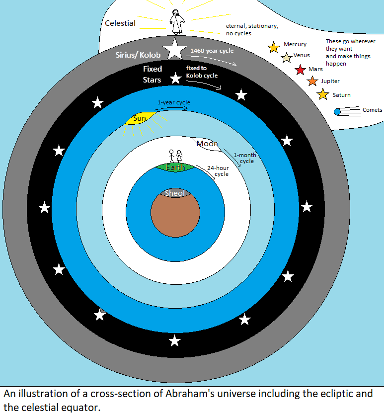 I’ve included here a schematic of the universe as Abraham knew it. It consists of concentric shells (probably cylinders) rotating within each other. The word “planet” as used by Abraham seems to refer to any one of these rotating shells. The farther up a shell or planet is, the more slowly it rotates, until you get to the Celestial Realm where God resides, which is eternal and stationary. The “fixed planets”, or stars, were considered fixed because they had no additional rotational motion relative to Kolob.