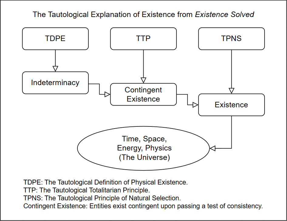 A new theory claims to have solved the mystery of existence completely. The tautological explanation of existence is laid out in detail in Jay’s Existence Solved: the Origin of the Universe and the Laws of Physics. The full text is available to read online. The explanation follows from logic alone and does not require the prior existence of an all-powerful god or any other kind of unexplained universe-creating environment or mechanism such as a quantum vacuum or an infinite multiverse. This does not imply that such entities do not exist, only that they are not necessary to explain the origin of existence.